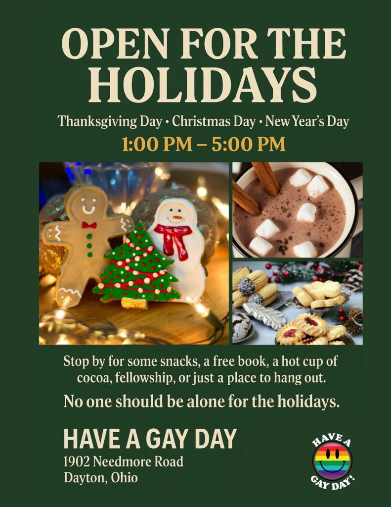 At Have A Gay Day, Inc., No one should be alone for the holidays — that’s why we proudly host Open For The Holidays, welcoming the community on Thanksgiving Day, Christmas Day, and New Year’s Day at our Dayton location (1902 Needmore Road). During these special holiday hours, we open our doors from 1 PM to 5 PM to offer warmth, connection, and joy for anyone who wants a place to come together during the season.